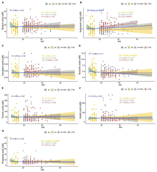 Graphs show correlations between SCFA plasma concentrations; butyric-(A), isobutyric-(B), isovaleric-(C), succinic-(D), formic-(E), acetic-(F) and propionic acid (G), and BMI. Lines correspond to medians. Blue lines correspond to the correlation over the whole BMI range, yellow ones to the correlation for the AN group, grey AN-REC, and red CTRL. The shaded line around each linear fit line represents a 95% confidence interval. p < 0.017 is considered significant.