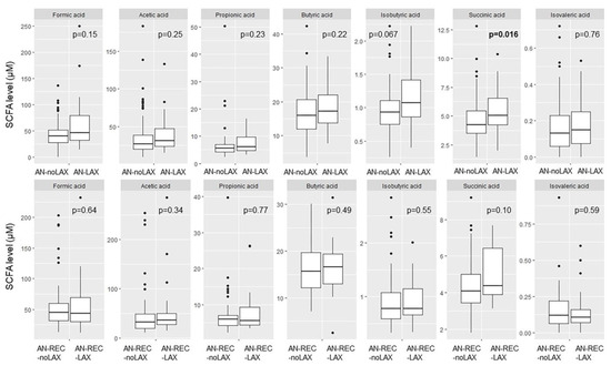 Box plots illustrate group differences in adjusted plasma concentration of SCFA in active and recovered AN with (AN-LAX, AN-REC-LAX) and without (AN-noLAX, AN-REC-noLAX) documented episodes of laxative use. The median is shown as a straight line and the box denotes the interquartile range. p < 0.017 is considered significant.
