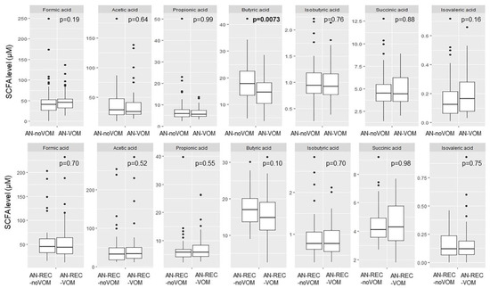Box plots illustrate group differences in adjusted plasma concentration of SCFA in active and recovered AN with (AN-VOM, AN-REC-VOM) and without (AN-noVOM, AN-REC-noVOM) documented self-induced vomiting. The median is shown as a straight line and the box denotes the interquartile range. p < 0.017 is considered significant.
