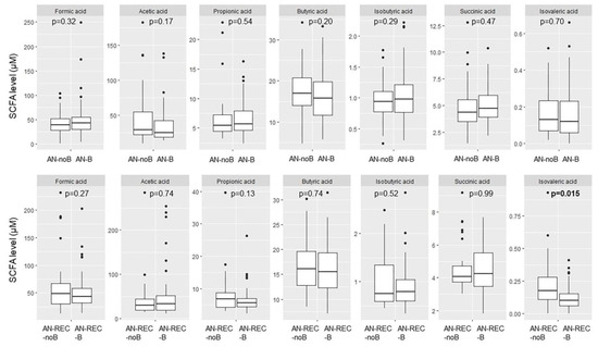 Box plots illustrate group differences in adjusted plasma concentration of SCFA in active and recovered AN (AN-REC) with (AN-B, AN-REC-B) vs without (AN-noB, AN-REC-noB) reported binge eating. The median is shown as a straight line and the box denotes the interquartile range. p < 0.017 is considered significant.