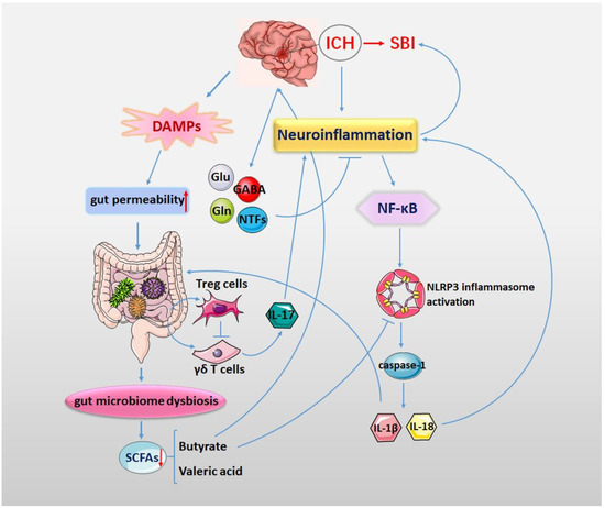 The gut microbiota is involved in the activation of the NLRP3 inflammasome that is an important regulator of microbiome-induced inflammatory responses. The gut microbiota can trigger inflammatory responses and affect disease outcomes by activating the NLRP3 inflammasome. Changes in the gut microbiota can affect neuroinflammation by activating the NLRP3 inflammasome and promoting the secretion of inflammatory cytokines [57,58]. The interplay between the gut microbiota and the NLRP3 inflammasome in neuroinflammation can be explained by the biological pathways influenced by the gut microbiota–inflammatory response–brain axis. Under pathological conditions such as ICH, the number of beneficial bacteria decreased in the intestinal tract, while that of unfavorable bacteria increased. The increased number of adverse bacteria in the intestinal tract, accompanied by the increase in harmful microbial products such as endotoxin, can lead to a gut barrier dysfunction, which induces the secretion of inflammatory cytokines from intestinal parietal cells, gut bacteria-derived pathogens and toxins (e.g., LPS) into the systemic circulation and activates peripheral NLRP3-associated inflammation. There is increasing evidence that an unfavorable gut microbiota is associated with the overexpression of NLRP3 in the gut, thereby activating the peripheral inflammasome and exacerbating neuroinflammation. NLRP3 can recognize PAMPs expressed by the gut microbiota and potentially cytotoxic mediators in the gut, leading to increased levels of gut inflammasome components. The microbial product LPS has also been shown to activate the NLRP3 inflammasome. However, depleting the gut microbiota by an antibiotic cocktail can influence inflammasome signaling in the brain, blood and intestine [59].