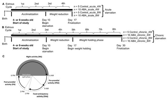 To mimic chronic starvation, the acute starvation phase was followed by another two weeks of starvation (Control_chronic_4W: n = 5; ABA_chronic_4W: n = 10; Control_chronic_8W: n = 5; ABA_chronic_8W: n = 10). In this phase, the mice received 60–80% of their average daily food intake (of the acclimatization phase). When the body weight differed by more than 2.5% compared with the target weight, the food quantity was increased or decreased in increments of 5%. The control groups were housed under the same conditions but were fed ad libitum during the whole experiment. Figure 1 shows a schematic summary of the experimental setup.