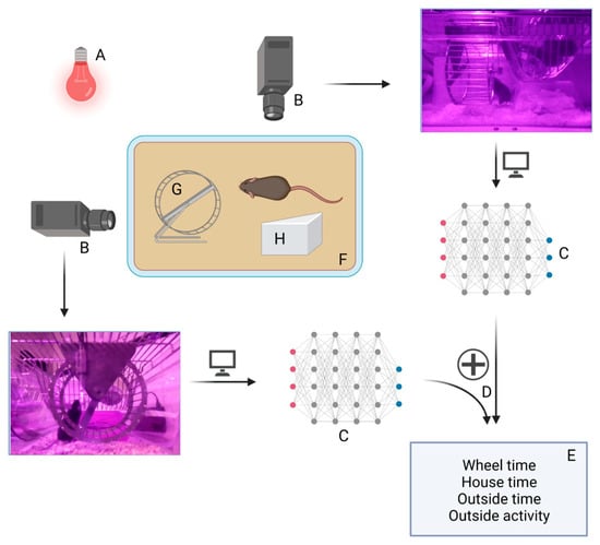 Overview of the different components of the Goblotrop system. Overview of the different components of the Goblotrop system. (A) infrared illumination, (B) infrared cameras from different perspectives, (C) neural networks, (D) fusing the output of the neural networks into parameters of interest, (E) parameter of interest, (F) cage of the mice, (G) running wheel, (H) house. Created with BioRender.com.