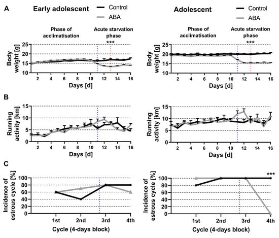 Acute starvation induces amenorrhea in adolescent mice. (A) The body weight, (B) running wheel activity measured by sensors, and (C) incidence of estrous cycle determined by histological examination of vaginal smears during acute starvation in early adolescent (left) and adolescent mice (right). The blue dotted lines represent the start of acute starvation phases and the red dotted line when ABA groups achieved a 20% body weight loss. The occurrence of the estrous cycle was determined in 4-day blocks based on the normal duration of the cycle in mice. (A,B) *** p ≤ 0.001, two-way ANOVA with repeated measurements. (C) Chi-squared tests comparing the incidence of the estrous cycle in ABA and control mice.