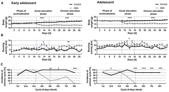 Chronic starvation in ABA mice leads to hyperactivity and amenorrhea. (A) The body weight, (B) running wheel activity explored with sensors and (C) incidence of the estrous cycle during chronic starvation in early adolescent (left) and adolescent mice (right). The blue dotted lines show the beginning of acute and chronic starvation phases, whereas the achievement of 20% body weight loss in ABA groups is presented with red dotted lines. (A,B) * p ≤ 0.05, ** p ≤ 0.01, *** p ≤ 0.001, two-way ANOVA with repeated measurements. (C) Chi-squared tests investigating the incidence of estrous cycle in control and ABA mice.
