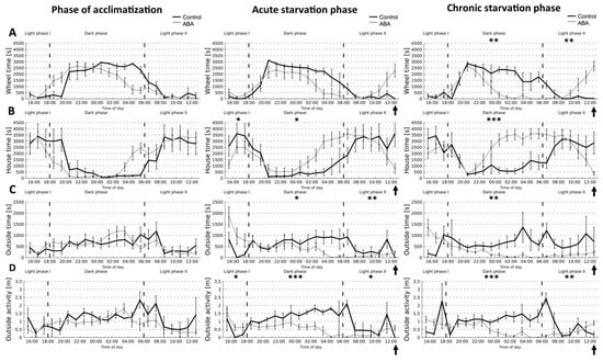 Starvation induces decreased circadian-rhythm-related activity at night. The different parameters, id est (A) wheel time, (B) house time, (C) outside time, and (D) outside activity, were measured with the tracking system Goblotrop during acclimatization, acute starvation, and chronic starvation in adolescent ABA (n = 8) and corresponding control mice (n = 4). Daily at 1 p.m., food was provided to the mice (marked with arrows). * p ≤ 0.05, ** p ≤ 0.01, *** p ≤ 0.001, two-way ANOVA with repeated measurements.