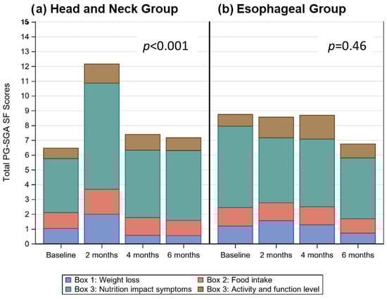 Stacked bar charts for (a) and (b) display the distribution of mean total PG-SGA SF scores over time, highlighting the contribution of weight loss (Box 1—blue), food intake (Box 2—red), nutrition impact symptoms (Box 3—teal), and activity and function level scores (Box 4—brown) to the total score at each time period.