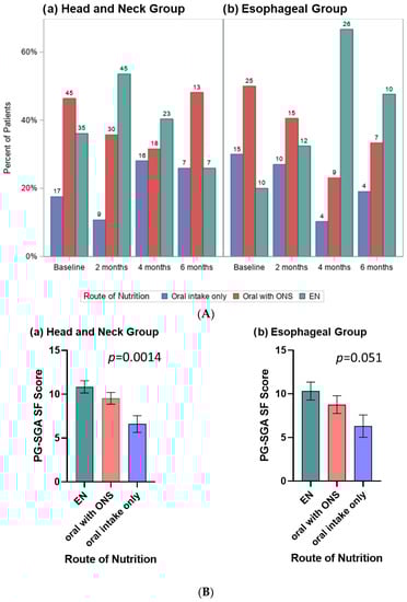 When evaluated using linear mixed models, after controlling for time period, PG-SGA SF scores varied across route of nutrition for HN (p = 0.0014) and trended to significance for ESO (p = 0.051) cancers (Figure 2B). The trend in both groups was for patients receiving EN to have the highest PG-SGA SF scores, followed by oral with ONS, and oral only route with the lowest scores.
