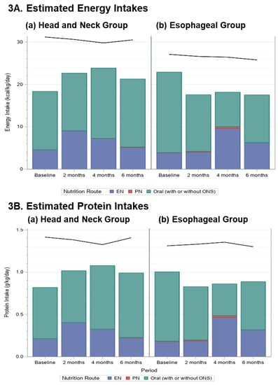 For the HN group, adequacy of energy (p = 0.14) and protein (p = 0.064) intakes did not change over time (Figure 3). For the ESO group, adequacy of energy intake declined (p = 0.0059) due to a reduction after baseline, but protein intake although decreased, was not affected (p = 0.082). It is notable that energy and protein intakes were below the prescribed amounts in all periods, and that, except for at 4 months in the ESO group, most of the nutrition was received orally (with or without ONS; Figure 3).