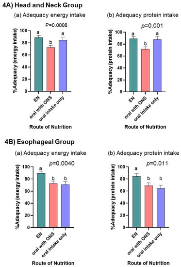Bar charts display the linear mixed model estimated mean (SE) % adequacy [(estimated intake/amount prescribed) × 100%] for energy and protein intake for the (A) Head and Neck Group (a,b) and (B) Esophageal Group (a,b) cancers. Each bar represents the within person estimated mean (SE) averaged across the different nutrition routes over time for an individual with an average PG-SGS SF score. p-values represent significant differences in % adequacy by route of nutrition adjusted for time period and PG-SGA SF score. a,b indicate differences (p < 0.05) between nutrition routes used.