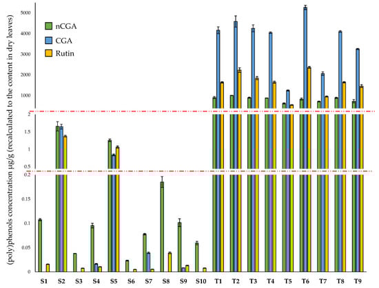 Chlorogenic acid (CGA), neochlorogenic acid (nCGA), and rutin content in samples expressed in µg/g (recalculated to the content in dry leaves). The red dotted lines indicate the gaps on the scale, for (poly)phenols concentration between 0.2–0.5 µg/g and between 2–400 µg/g).