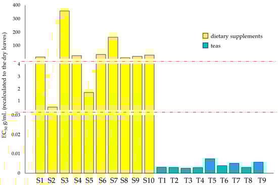 Oxidative stress plays a critical role in diabetes and many other serious conditions, including aging, cancer, chronic inflammation, neurodegenerative diseases, atherosclerosis, etc. Therefore, plant materials showing antioxidant activity arouse the interest of researchers. Naturally occurring nutrients with potent antioxidant properties are (poly)phenols [45] found in dried white mulberry leaves. A commonly used method in assessing antioxidant properties (as free radical scavenging) is the DPPH• assay. The results of the evaluation of free radical scavenging capacity for white mulberry dietary supplements and teas are presented in Figure 5. The lower the EC50 value, the greater the antioxidant capacity of the product. Since the EC50 values differ significantly, gaps on the scale were used for better visualization and comparison of the results (the gaps were marked with the red dotted lines).