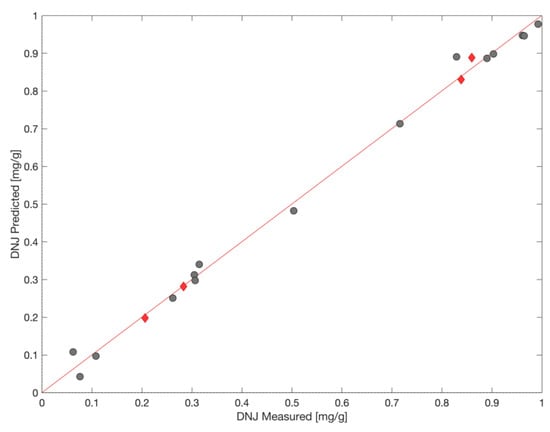 Results of iPLS model. Relationships between measured and predicted values of DNJ concentration using the model (●—calibration set, ♦—test set). LV number = 6; cross-validation method: leave-one-out; RMSECAL = 0.025; RMSECV = 0.095; RMSEPRED = 0.016; R2CAL = 0.995.