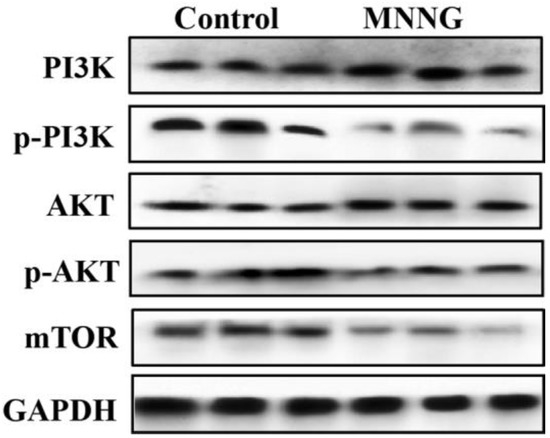 MMNG decreased the PI3K/AKT pathway activation in the gastric tissues of rats. Rats were exposed to MNNG (100 mg/kg BW) every 5 days for 12 weeks. MNNG inhibited the expressions of phosphorylated PI3K, phosphorylated AKT, and mTOR. Tissues were from n = 3 rats as representative images.