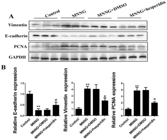 Hesperidin attenuated EMT and proliferation elicited by MNNG. Rats were divided into a control group, an MNNG group, an MNNG and solvent control group, and an MNNG and hesperidin group: (A) analysis of protein expression of EMT and proliferation markers by Western blotting. Tissues were from n = 3 rats as representative images; (B) real-time PCR analyzed mRNA levels of EMT and proliferation markers. Real-time PCR results are the samples from 3 rats, and the experiment was repeated three times. GAPDH served as the housekeeping gene; ** p < 0.01, compared with control group; # p < 0.05; compared with MNNG group.
