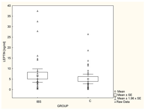 Leptin concentrations did not differ between children with IBS and healthy controls. We demonstrated their positive correlation with BMI, weight, and waist circumference, as well as the metabolic parameters HOMA-IR, CRP, TG, and insulin levels. One study conducted in adults with IBS revealed significantly higher leptin concentrations compared to healthy control subjects [14], while another study found lower levels [15]. The findings of most authors [16,18,19] are in accordance with our results. The studies mentioned [14,15,18,19] confirmed the well-known association between leptin and weight/BMI [14,27,52], but metabolic parameters were generally not assessed, except in the research by Weaver et al. [18], who demonstrated a positive correlation between leptin and total cholesterol in females. Although Russo et al. [16] did not find any significant differences in leptin levels between patients with diarrhea-predominant IBS (IBS-D) and healthy controls, their more thorough research demonstrated significantly higher leptin concentrations only in the IBS-D subgroup with altered small-intestinal permeability [17]. Additionally, sex hormones may modulate leptin secretion directly and indirectly by impacting the distribution of adipose tissue in the body [53]. Interestingly, Weaver et al. [18] postulate that disturbances in the functioning of normal feedback mechanisms along the hypothalamic–pituitary–gonadal axis observed in women with IBS may be involved in the exacerbation of symptoms.