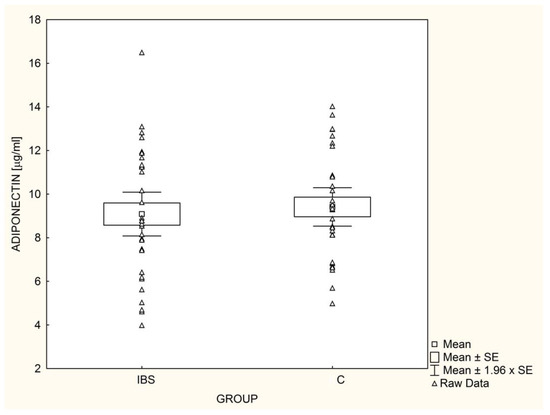 In our study, there were also no differences in adiponectin concentrations between the groups. There are no data on serum adiponectin levels in children with IBS, and studies involving adult patients have yielded contradictory findings [16,17,20]. In the two publications by Russo et al. [16,17], serum adiponectin levels were significantly higher in patients with IBS-D (especially with normal small-intestinal permeability) in comparison to healthy controls, whereas Baram et al. [20] reported the opposite results in a group including patients with all types of IBS. Unfortunately, correlations between adiponectin and anthropometric and metabolic parameters were not assessed in these studies, and the clinical characteristics of the examined groups only involved BMI [16,17,20] and body fat percentage [20], which were not different between patients and healthy controls.
