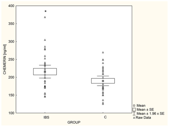 Similarly to Baram et al. [20], we found significantly higher chemerin concentrations in IBS patients than in controls. They also demonstrated that an increase in pro-inflammatory adipokine levels is associated with an increase in the severity of symptoms [20].