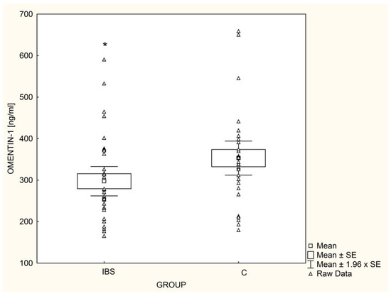 The mean chemerin concentrations were significantly higher (p = 0.03) in IBS patients (Figure 3); this was also found after adjusting for gender, TG, HDL, and HOMA-IR. In contrast, omentin-1 serum concentrations in IBS patients were significantly lower (p = 0.04) than in healthy children (Figure 4), even after adjusting for gender, TG, HDL, and HOMA-IR. Among IBS patients, leptin levels were positively correlated with chemerin concentrations (r = 0.62, p < 0.001) and inversely correlated with serum omentin-1 (r = −0.60, p < 0.001). In the control group, concentrations of adipokines showed no significant associations with each other.
