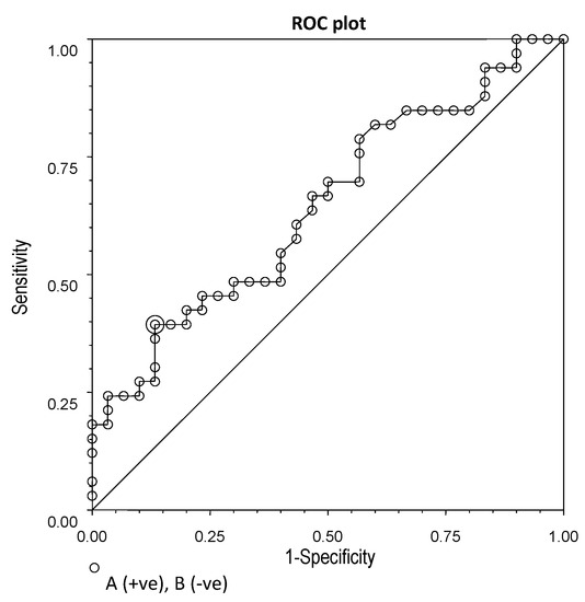 ROC plot for chemerin concentrations (cut-off point: 232.8 ng/mL; sensitivity: 0.60; specificity: 0.80; efficiency: 0.64).