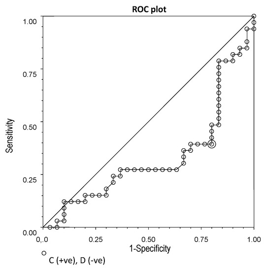 ROC plot for chemerin concentrations (cut-off point: 232.8 ng/mL; sensitivity: 0.39; specificity: 0.87; efficiency: 0.76).