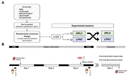 Study overview. (A) A randomized, crossover study design including two sessions on isocaloric diets whether HPLC or LPHC. (B) Each session comprised three days of intervention during which sleep was measured by polysomnography. Salivary samples were collected on the third day of each session from melatonin assessment. The intervention was followed by 24-h free living evaluation of physical activity, and ad-libitum dietary intake; SB: sedentary behavior.