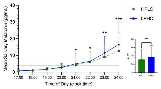 The time courses of salivary melatonin secretion and area under the curve (AUC) in HPLC vs. LPHC diets. HPLC: high-protein, low-carbohydrate; LPHC: low-protein, high carbohydrate. *: significant difference (HPLC vs. LPHC) with p < 0.05. **: significant difference (HPLC vs. LPHC) with p < 0.01. ***: significant difference (HPLC vs. LPHC) with p < 0.001.