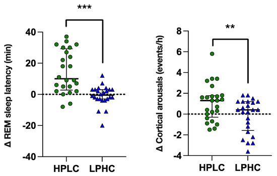 REM latency and arousals variation in response to HPLC vs. LPHC diets. Data are shown as median ± interquartile range with scatter-plots representing individuals’ data. p value: ** p < 0.01; *** p < 0.001.