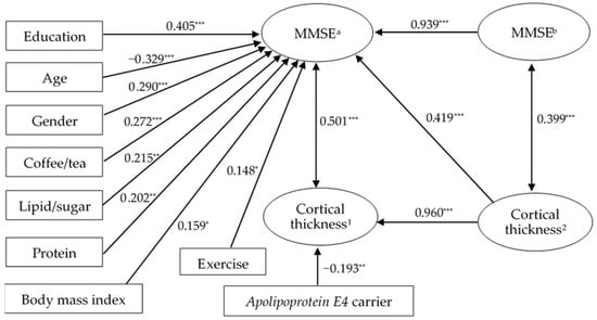 The correlation coefficients of demographic variables, three dietary patterns and MMSE. MMSE positively correlates with education, gender, 3DPs and exercise, except for age. Cortical thickness has an inverse correlation with APOE4 but a high correlation with MMSE. However, MMSE and cortical thickness have a pair-wise high correlation. Cortical thickness represents composite scores of hippocampus, amygdala and nucleus accumbens. Cortical thickness1: Time point corresponds to dietary pattern data collection; Cortical thickness2: available historical data with the closest time point with cortical thickness1. MMSEa: time point corresponds to dietary pattern data collection, MMSEb: one year prior to MMSEa; *: p-value < 0.05; **: p-value < 0.01; ***: p-value < 0.001. MMSE, Mini-mental state examination.