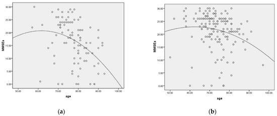 A scatter plot of age versus MMSEa for the patients who lived with a spouse (p-value = 0.022) or not (p-value < 0.001). Slower decline in MMSEa was found in those living with a spouse. MMSE, Mini-Mental State Examination. (a) The patients who did not live with a spouse; (b) the patients who lived with a spouse.