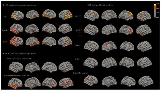 We assessed the cortical degenerative patterns stratified by clinical subtypes, BMI groups and blood levels (Figure 3). Overall, the AD patients showed degeneration in the medial and lateral temporal regions and pregenual areas (Figure 3A). The RCD group showed more extensive cortical thickness atrophy in the lateral temporal region and medial temporal regions, but statistical significance was not found compared with the stable group. Although a higher proportion of the patients was obese, the effects of cortical degeneration were more obvious in the underweight group (Figure 3B) and showed in the pregenual region and lateral temporal area. For blood profile correlations (Figure 3C), a higher HbA1c was related to medial prefrontal region degeneration. The effects of B12 and folate were emphasized in the anterior cingulate and lateral temporal regions. Regions related to HDL and total cholesterol were relatively scattered, while the correlations with LDL or total triglyceride levels were not significant.