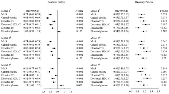 There was not a significant association in MetS except for central obesity and elevated blood pressure in participants of diversity pattern when compared with those of northern pattern. The OR of MetS was 0.91 (95%CI: 0.80–1.03, p = 0.144) in participants with diversity patterns by adjusting confounders. Meanwhile, the ORs and 95%CI of elevated TG decreased HDL-C, and elevated glucose was 1.01 (0.88–1.16, p = 0.917), 1.08 (0.95–1.23, p = 0.257), and 0.96 (0.85–1.10, p = 0.59) respectively in diversity pattern. Nevertheless, there was a significant inverse relationship of diversity pattern with central obesity and elevated blood pressure, with an OR (95%CI) of 0.82 (0.71, 0.94; p = 0.005) and 0.77 (0.67, 0.88; p < 0.001) respectively for diversity pattern after being adjusted potential confounders (Figure 1).