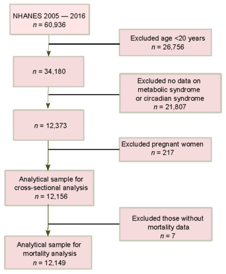 In the current analysis, we used data from six survey cycles (2005–2006, 2007–2008, 2009–2010, 2011–2012, 2013–2014, and 2015–2016) with 12,156 participants (Figure 1). Participants below the age of 20 years were excluded from the study. NHANES has collected sociodemographic, lifestyle (including sleep), disease history, and health-related data that include clinical measures of blood pressure, fasting blood glucose, serum lipids, including triglycerides and high-density lipoprotein (HDL) cholesterol, and self-reported drug use for health conditions. Participants with missing values of components used to define MetS or CircS components were excluded from the study. The final analytical sample for the cross-sectional analysis included 12,156 participants (Figure 1), but seven individuals had missing data on mortality.