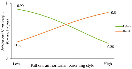 Simple slope analyses revealed a significant relationship between the paternal authoritarian style and the risk of overweight/obesity among adolescents living in rural areas (B = 0.622, SE = 0.317, Wald = 3.864, ExpB = 1.863, p = 0.04), but not in urban areas (B = −0.117, SE = 0.233, Wald = 0.254, ExpB = 0.889, p = 0.614). The odds of overweight/obesity among adolescents living in rural areas with authoritarian fathers were nearly twice those of urban adolescents (Figure 1). The test for equality of regression coefficients corroborated that the effect of authoritarian fathers on adolescent overweight/obesity varied significantly between urban and rural areas (Z = −1.878, p = 0.030).