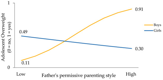 Analyses also showed a significant three-way interaction between a permissive paternal style and adolescent sex and area of residence on overweight/obesity risk (B = 1.845, SE = 0.816, Wald = 5.113, ExpB = 6.328, p = 0.024). Two post hoc logistic regression analyses were conducted separately for each area of residence. In urban areas, a significant interaction was found between permissive fathers and adolescent sex on overweight/obesity risk (B = −1.297, SE = 0.538, Wald = 5.815, ExpB = 0.273, p = 0.016), but this interaction was not significant in rural areas (B = 0.465, SE = 0.619, Wald = 0.563, ExpB = 1.592, p = 0.453).