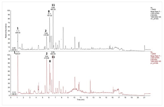 | Peak | Compound 1 | RT (min) | [M-H]− (m/z) | MS/MS Ions (m/z) 2 | References |