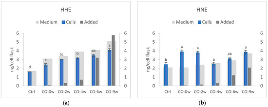 Cellular content of HHE (a) and HNE (b) (ng/T25 cell flask). The HT29 cells were cultured in growth media (Ctrl) or growth media and camelina oil (CO, 0.5 mg/mL) with increasing oxidation levels for 72 h. Cellular data (cells) are means (n = 2) shown with standard error mean. The figures also show the analysed medium concentration (Medium) of HHE and HNE as well as the calculated levels (Added) of HHE and HNE from the camelina oil added to the medium. Significant differences in cellular content of hydroxyalkenals are indicated with different letters evaluated with Tukey–HSD (p < 0.05). w = weeks.