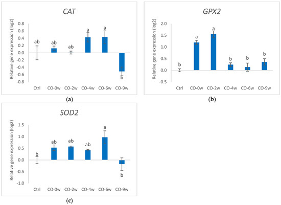 Relative gene expression (log) of markers for antioxidant defence: (a) CAT, (b) GPX2, and (c) SOD2 in HT29 cells exposed to oxidized camelina oil. All groups, except the control group (Ctrl), were cultured in growth media containing 0.5 mg/mL oxidized camelina oil for 72 h. Data (n = 4) are means shown with standard error mean. Significant differences are indicated with different letters evaluated with Tukey–HSD (p < 0.05). CO = camelina oil; w = weeks.