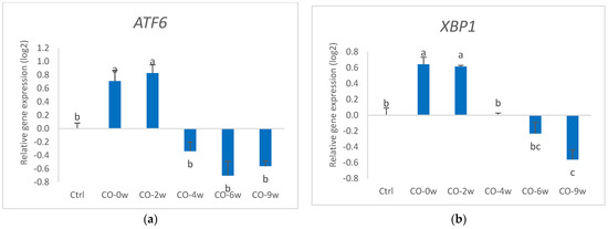 Relative gene expression (log) of markers for antioxidant defence: (a) ATF6 and (b) XBP1 in HT29 cells exposed to oxidized camelina oil. All groups, except the control group (Ctrl), were cultured in growth media containing 0.5 mg/mL oxidized camelina oil for 72 h. Data (n = 4) are means shown with standard error mean. Significant differences are indicated with different letters evaluated with Tukey–HSD (p < 0.05). CO = camelina oil; w = weeks.