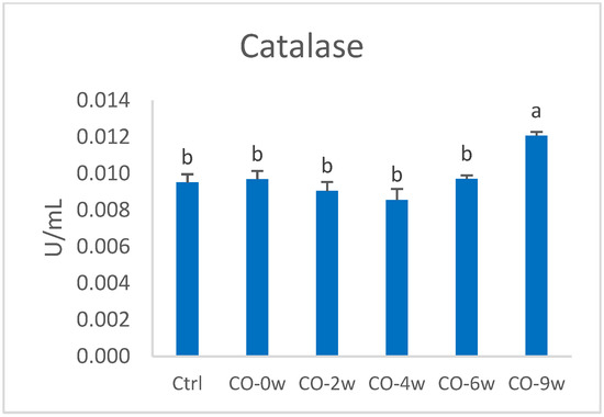 The cells exposed to the most oxidized camelina oil (CO-9w) showed increased enzyme activity of superoxide dismutase compared to that of the control and CO-2w (Figure 4). The activity was 22.3% higher in CO-9w compared to the control. The CO-9w also showed significantly higher catalase activity, compared to all the other groups, with 26.9% higher activity compared to that of the control (Figure 5).