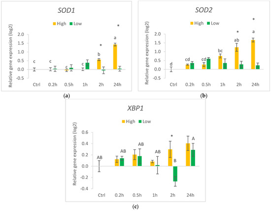 The highest dose of HHE (140 µM) induced increasing expressions of both SOD1 and SOD2 during the 24 h time course (Figure 7). Compared to the control and earlier time points, the gene expression of SOD1 was significantly higher after 2 h of incubation and that of SOD2 after 1 h incubation when cultured in 140 µM HHE. For both genes, the Low and High groups were significantly different at only 2 and 24 h. There were no differences in the gene expression of SOD1 and SOD2 between the different time points when cultured in the low concentration of HHE. The gene expression of XBP1 was, however, not significantly different over 24 h in the cells incubated with the highest concentration of HHE, while the expression in cells cultured in the low HHE concentration was significantly higher at 24 h than at 2 h.