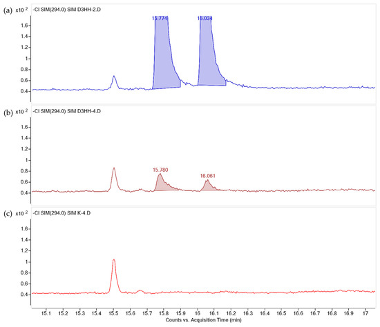 Identification of SIM (m/z 294) traces of syn- (15.774 min) and anti- (16.061 min) isomers of PFB-silyl-ether derivatives of deuterated HHE. The HT29 cells were cultured in growth medium (Ctrl) without HHE and growth medium with 40 µM deuterated HHE (n = 4) for 0.5 h. (a) Deuterated quantification HHE standard; (b) cells cultured in 140 µM deuterated HHE; and (c) cells cultured in growth medium without HHE.