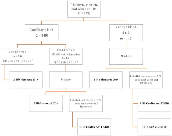 - Dasi, T.; Palika, R.; Pullakhandham, R.; Augustine, L.F.; Boiroju, N.K.; Prasannanavar, D.J.; Pradhan, A.S.; Kurpad, A.V.; Sachdev, H.S.; Kulkarni, B. Point-of-Care Haemoglobin Measurement in Pooled Capillary Blood by a Portable Autoanalyser: Comparison with Venous Blood Haemoglobin Measured by Reference Methods in Cross-Sectional and Longitudinal Studies. Br. J. Nutr. 2021, 128, 1108–1117. [Google Scholar] [CrossRef] [PubMed]