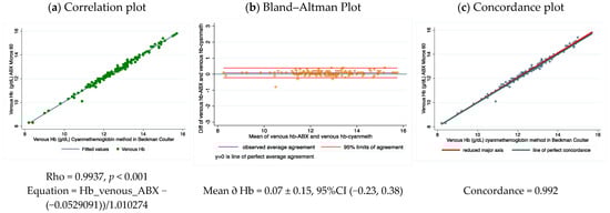 Correlation (a), Bland–Altman (b) and Concordance (c) plot for Hb concentrations by venous blood samples using the cyanmethemoglobin method and the HemoCounter ABX Micros 60.
