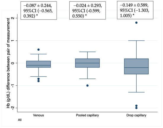 Box plots of Hb difference * (g/dL) between measurement duplicate analyzed using the HemoCue 201+. * Bland–Altman Mean ± SD; (95% CI).
