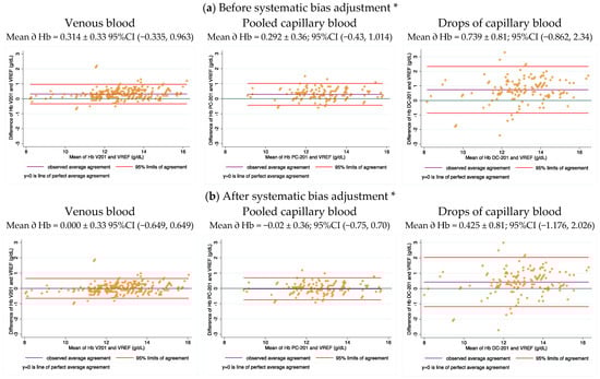 Figure 4 shows the Bland–Altman plots of Hb measurements using HemoCue in venous blood, PCB, and DCP against the measurements of the corresponding paired samples analyzed using venous blood in the cyanmethemoglobin method, before and after adjustment for the systematic HemoCue average bias. As expected, after bias adjustment, values of both venous blood and PCB in HemoCue showed negligible average biases (0.00 and −0.02 g/dL, respectively). However, despite adjustment, DCB maintained a higher positive average bias (0.425 g/dL).