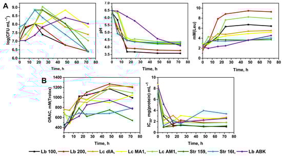 Figure 1. (A)—The general fermentation parameters of the screened strains of lactic acid bacteria; (B)—The development of antioxidant and ACE-I activities in the milk fermented by the screened strains of LAB. Strains of Lactobacillus delbrueckii and Lacticaseibacillus paracasei are abbreviated as Lb; strains of Lactococcus lactis and Streptococcus thermophilus are abbreviated as Lc and Str, respectively. For all datapoints the standard error from three biological replicas did not exceed 5%.