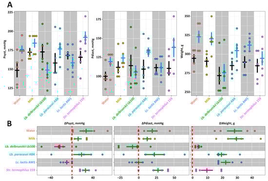 Figure 2. The in vivo assessment of antihypertensive properties for the milk fermented by the chosen strains of lactic acid bacteria using Spontaneously Hypertensive Rat (SHR) animal model: (A)—the absolute values of the Psyst, Pdias and Weight. The black bars correspond to the Mean ± SE at the beginning of the experiment, and the blue bar correspond to the Mean ± SE at the end (4 weeks) of the experiment; (B)—the changes of the Psyst, Pdias and Weight. The bars (Mean ± SE) for the groups between which no statistically-significant differences were detected are depicted in the same color.
