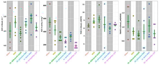 At the end of the experiment all animals were euthanized, and several health-relevant biochemical parameters were assessed. No statistically-significant differences (p > 0.05) of the ACE activity were observed in the animals’ blood (Figure 3). In the animals’ aorta, the ACE activity was significantly lower (p < 0.05) in the ABK and St159 groups compared to the Intact and Control groups, and for the Lb100 and AM1 groups only the downward trends were observed. For all animals, the level of the oxidative stress was assessed by the measuring of TEAC and TBARS concentration in blood (Figure 3). The TEAC value represent an overall antioxidant capacity of biological sample [46], and TBARS value corresponds to the advancement of lipid peroxidation under the oxidative stress. For all animal groups, the values of both TEAC and TBARS were not statistically-significantly different (p > 0.05). However, there was a trend for the milk fermented with Lb. delbrueckii Lb100 to have higher TEAC and lower TBARS than in other fermented products.