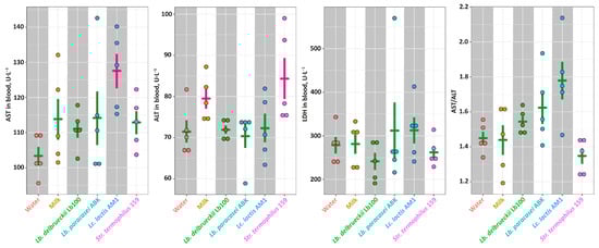 The function of liver was assessed by measuring widespread biomarkers of liver health—AST, ALT and LDH (Figure 4). Although the significantly elevated (p < 0.05) level of AST was detected in the AM1 group, and the significantly elevated (p < 0.05) level of ALT in the Milk and St159 groups, the AST/ALT ratios were not statistically-significantly different (p > 0.05) for all studied groups. Similarly, the level of LDH in blood was the same for all studied groups.